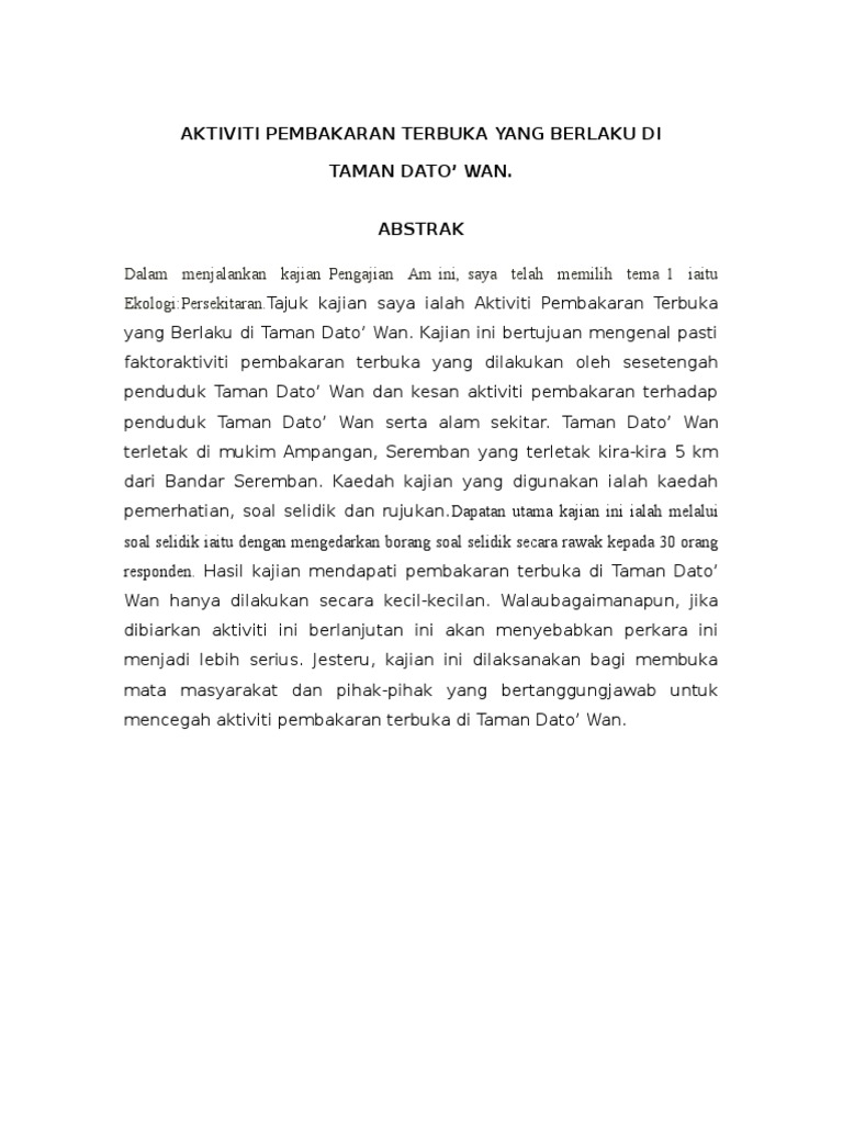Kerja kursus ini wajib dilaksanakan oleh calon stpm, iaitu calon sekolah kerajaan, calon sekolah banttuan kerajaan,c alon sekolah swasta dan calon persendirian individu sebagai sebahagian komponen penilaian penggal 2. 2.0 objektif kajian kajian ini dijalankan untuk mencapai empat objektif utama berkaitan campuran pemasaran yang dilaksanakan oleh syarikat * global sdn bhd. Tajuk kerja kursus pengajian am 2020. Penggunaan sains dan teknologi dalam penghasilan dan pemasaran biskut tradisional pengenalan 1 2.0 objektif kajian 4 3.0 lokasi kajian 5 3.1 peta negeri pulau pinang 5 3.2 peta sungai jawi, pulau pinang 6 3.3 peta kampung valdor 7. Manual ini khusus untuk kegunaan guru, pemeriksa, dan calon sahaja.