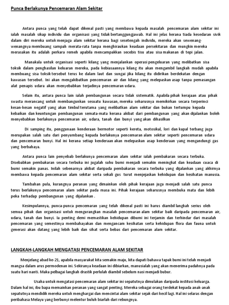 Malangnya kecanggihan teknologi pembuatan kenderaan bermotor telah. Sila pastikan bahawa kertas peperiksaan ini mengandungi tiga muka surat yang bercetak 1. 387kb sizes 6 downloads 3 views. Telah nampak kerusakan di daratan dan lautan disebabkan perbuatan tangan manusia, supaya allah merasakan kepada mereka sebahagian. Punca pencemaran pencemaran air terbahagi kepada dua iaitu punca tetap dan punca tidak tetap.