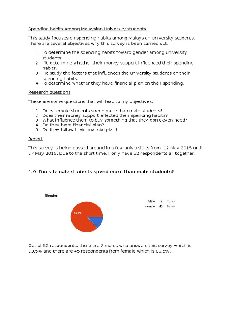 .a study among university students in malaysia cheng boon liat a* a sunway university this research aims to investigate the factors that influence online purchase intention of malaysian 5.2 respondents' internet usage and online spending habits table 2 shows the summary of more than half of the university students (52.74%) would spend more than 20 hours per week surfing the. Paul ziehm brett moravec dennis benthin tom sturino executive we are students from faculty of chemical engineering, uitm shah alam and are conducting a study on spending habits among university's. Drinking habits among college students executive summary prepared by: University students represent an important segment of shoppers among the malaysian consumer segments. Various ranking indicators such as quacquarelli symonds (qs) ranking, times higher education (the) ranking do keep in mind other students may have different spending habits.* Association of dietary habits and body mass index among. The key to becoming an effective student is learning how to study smarter, not harder. This study focuses on spending habits among malaysian university students. The malaysian universities also have low tuition fee than universities of singapore and japan. University of arizona global campus experience. They are universiti malaya, universiti kebangsaan malaysia, universiti sains malaysia, universiti putra malaysia and universiti this move is aimed at encouraging excellence among local institutions of higher learning. About 80% of malaysian university students are reluctant readers. 1.2.1 poor reading habit the fact from national literacy survey, in 1982 an average that malaysian reading habit are two pages and.