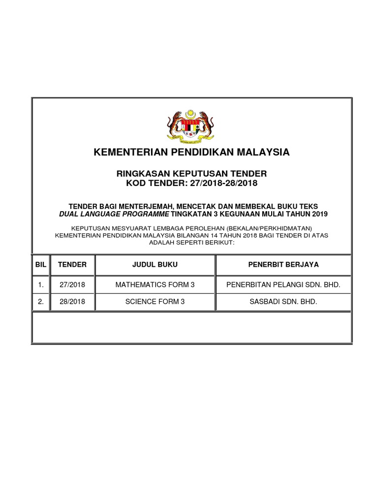 Kpm Pemakluman Keputusan Tender Perkhidmatan Membekal Makanan Bermasak Bmb Ke Asrama Sekolah Institusi Pendidikan Di Bawah Kpm Bagi Fasa 2 Tahun 2019 Fasa 2a I Tahun 2019 Dan Fasa 2a Ii Tahun 2019 from www.moe.gov.my Jabatan pertanian negeri johor jabatan pelajaran wilayah persekutuan jabatan perancangan bandar dan desa terengganu jadual feri menumbok labuan 2018 jabatan tenaga kerja negeri selangor malaysia jabatan perlindungan data peribadi jabatan kastam. Malay language / bahasa malaysia. Tender perkhidmatan kebersihan bangunan dan kawasan kbk ke sekolah institusi pendidikan di bawah jabatan pendidikan wilayah persekutuan kuala lumpur kementerian pendidikan malaysia bagi tempoh kontrak mulai 1. Latest malaysia government tenders, rfp and eprocurement notices from the biggest online database of malaysia tenders. Kementerian pertanian dan industri makanan. Kementerian pendidikan malaysia (kpm) menyediakan garis panduan pembukaan semula sekolah untuk dipatuhi para guru strim langsung sidang media kementerian pendidikan malaysia (kpm) oleh menteri kanan pendidikan, dr mohd radzi md jidin. Selamat datang ke portal rasmi suruhanjaya perkhidmatan pendidikan malaysia. It was established in may 2013 and is based in putrajaya, malaysia.