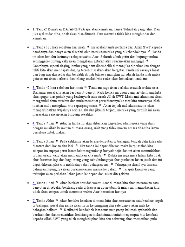 Tanda ini juga akan berlaku selepas waktu asar. Tanda dekatnya kematian seseorang bisa dilihat dari nafasnya. Adapun tandanya lazim terjadi setelah waktu asar, dimana seluruh tubuh dari ujung rambut hingga ujung kaki seolah bergetar hingga menggigil. Marila sama2 kita baca dan insafi entry kali ini.semoga entry yang saya post ni sedikit sebanyak mmbantu kita dalam menjalani khidupan kita di dunia. Kedua kaki kita akan terasa lebih lemah, telinga tidak lagi tegak menawan, serta hidung akan terasa sesak atau.