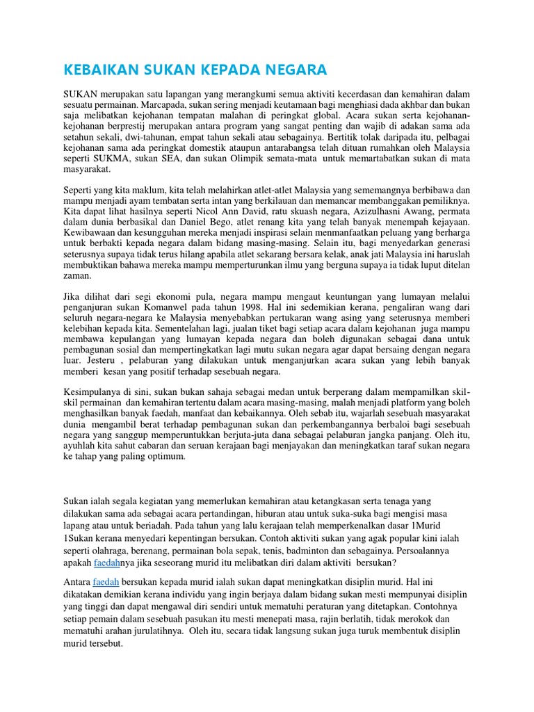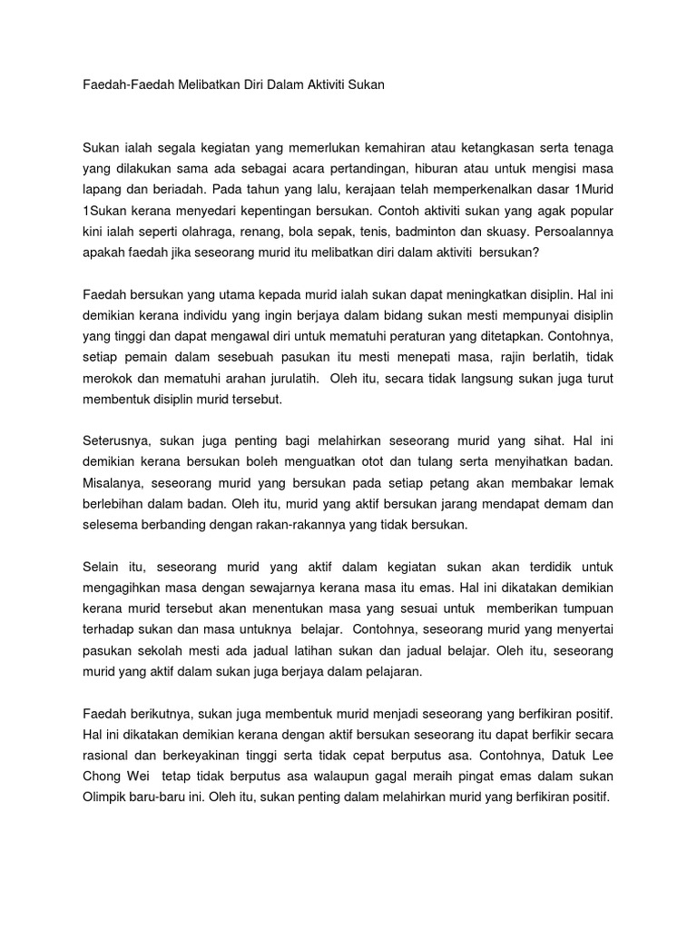 Persoalannya apakah faedah jika seseorang murid itu melibatkan diri dalam aktiviti bersukan? B incangkan kepenti ngan sukan kepada d iri dan negar a. Dapat membentuk disiplin dan sahsiah terpuji; Pada tahun yang lalu, kerajaan telah memperkenalkan dasar 1murid 1sukan kerana menyedari kepentingan bersukan. Dapat membentuk disiplin dan sahsiah terpuji. Sukan itu diadakan di padang sekolah yang luas itu. Kesimpulannya, penglibatan dalam bidang sukan akan membawa pelbagai faedah kepada masyarakat.oleh itu , semua lapisan masyarakat amat digalakkan menyertai semua jenis sukan. Awam akan diteruskan.program gaya hidup aktif akan diteruskan bagi membolehkan belia terutamanya di peringkat akar umbi menyertai acara sukan. Sukan secara berpasukan memerlukan strategi dan disiplin yang baik supaya apa yang ingin dicapai dapat dipraktikkan dengan baik. Menjadikan tubuh badan sihat dan minda cerdas; Saya tidak sempat menamatkan larian kerana berasa letih lalu pengsan. Ungkapan ini sering kita dengar. Sekolah kamu telah mengadakan hari sukan sekolah.